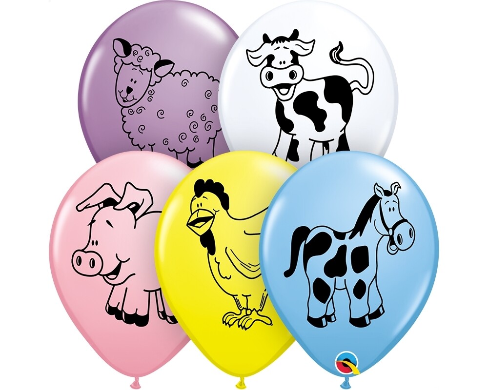 Our Farm balloon bouquet is made up of a mixture of printed latex balloons and plain latex balloons. (Colours are mixed and vary depending on availability).